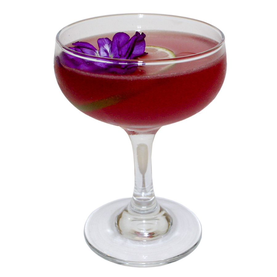 Shake ingredients with ice and double strain into a coupe glass. Garnish with lime wheel and flower.